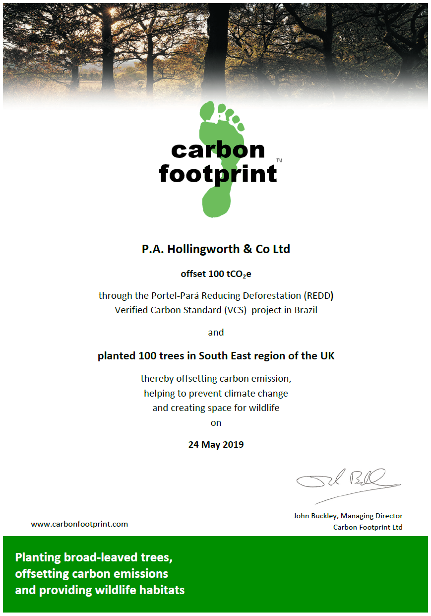 At P A Hollingworth Ltd we have always taken our environmental responsibilities very seriously. However, we are going one step further this year and neutralising our carbon impact on the planet.